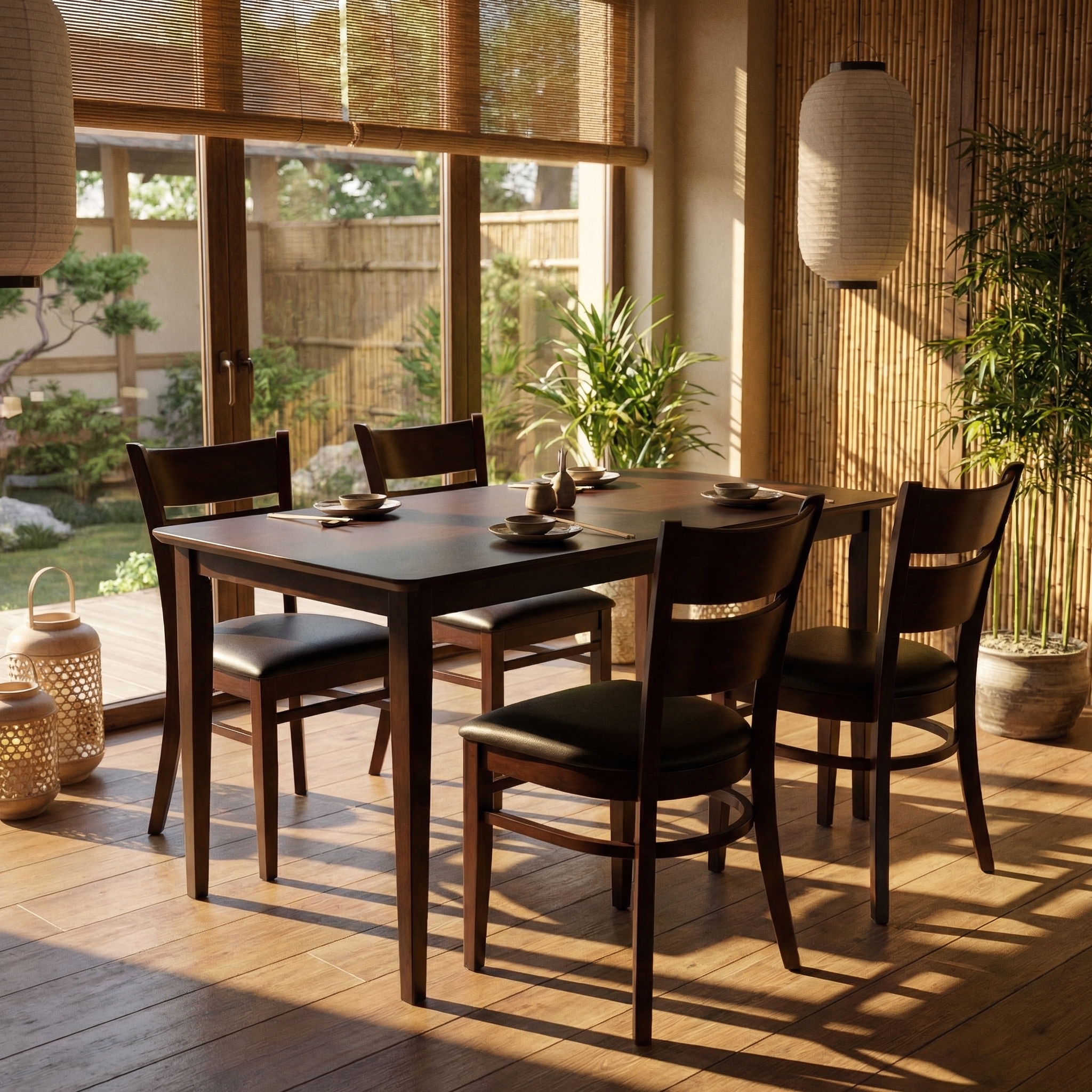 Set in legno massiccio con 1 tavolo e 4 sedie. Disponibile anche nei formati 90x90 e 150x90 cm. Comode sedie da ristorante e un tavolo classico da 120x75cm.